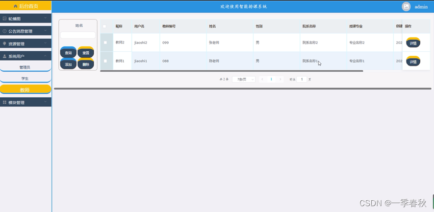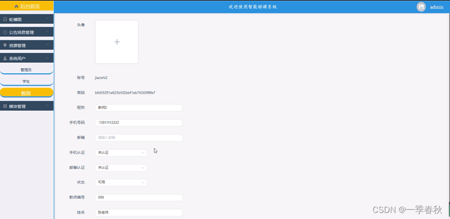 3、功能的完善性:拥有首页、个人资料、轮播图管理、公告消息管理、系统用户(管理员、学生、教师)资源管理(校园资讯、资讯分类)模块管理(学生信息、院系管理、专业管理、班级管理、课程信息、教室管理、选课信息、课程测试、提交测试、成绩录入、排课管理、课表管理)等功能的修改维护操作。