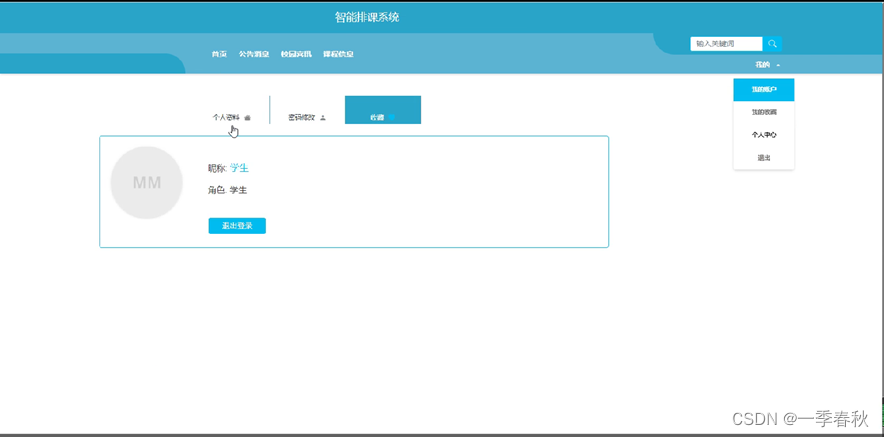 在网络发展的时代,教育部对教师排课的越来越重视,学校的排课更加智能化,给教师带来了很大的选择余地,而且教师越来越追求更个性的需求。在这种时代背景下,网络排课成为必须。本设计主要实现集人性化、高效率、便捷等优点于一身的智能排课系统,完成系统首页、个人资料、轮播图管理、公告消息管理、系统用户(管理员、学生、教师)资源管理(校园资讯、资讯分类)模块管理(学生信息、院系管理、专业管理、班级管理、课程信息、