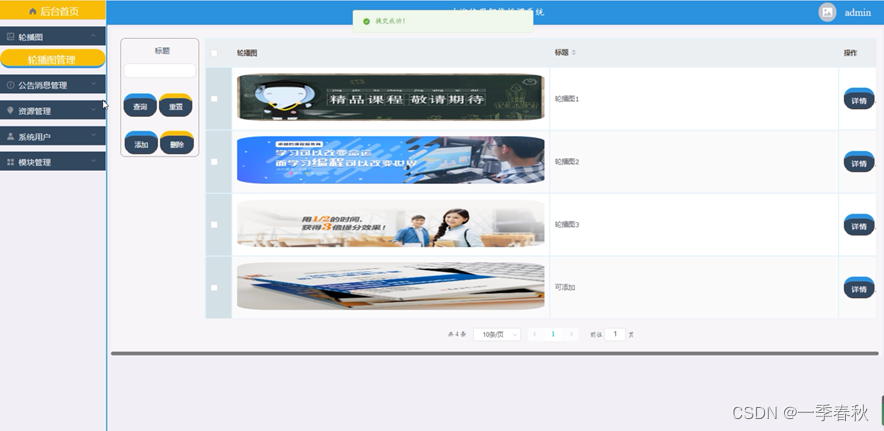 轮播图管理:可以查看轮播图信息的标题,封面图,内容等详细描述等信息。可以进行查询、重置、删除、添加等操作,如图所示。