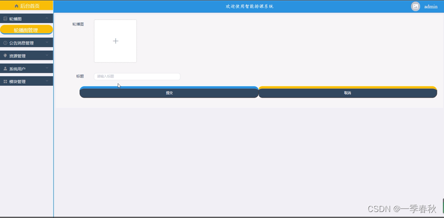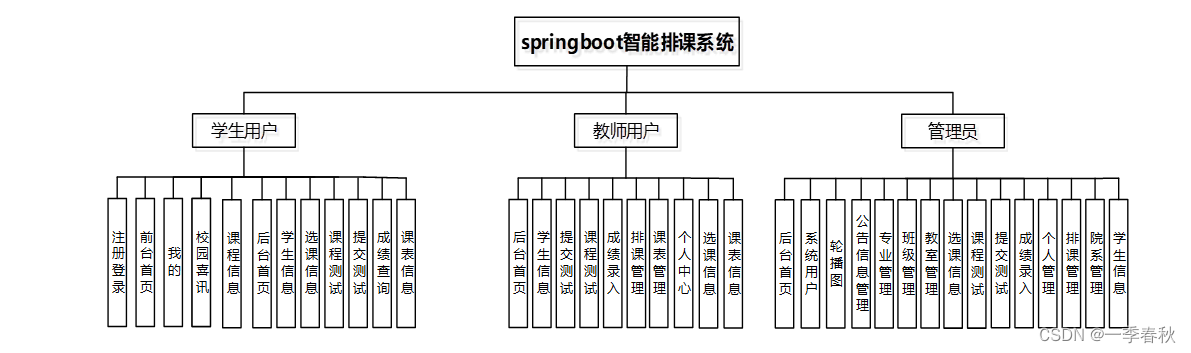 (1)功能要求:首页、个人资料、轮播图管理、公告消息管理、系统用户(管理员、学生、教师)资源管理(校园资讯、资讯分类)模块管理(学生信息、院系管理、专业管理、班级管理、课程信息、教室管理、选课信息、课程测试、提交测试、成绩录入、排课管理、课表管理)等功能模块。
