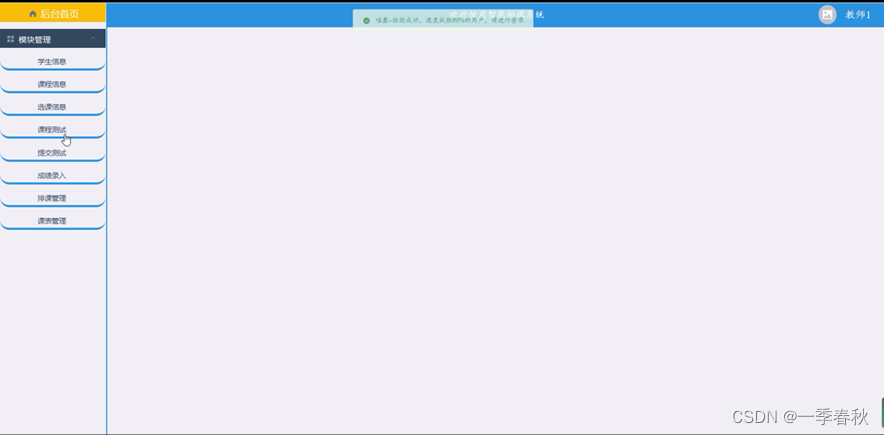 教师用户进入系统后台可以查看:后台首页,模块管理(学生信息、课程信息、选课信息、课程测试、提交测试、成绩录入、排课管理、课表管理),个人中心等功能,还可进行相应的操作,如图所示。