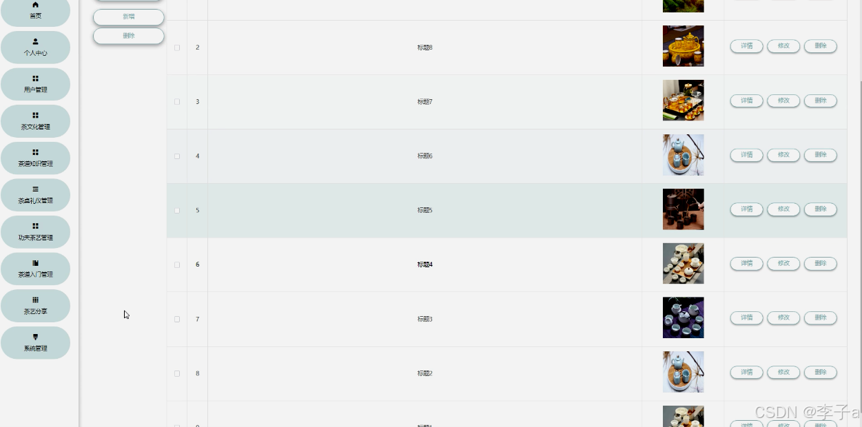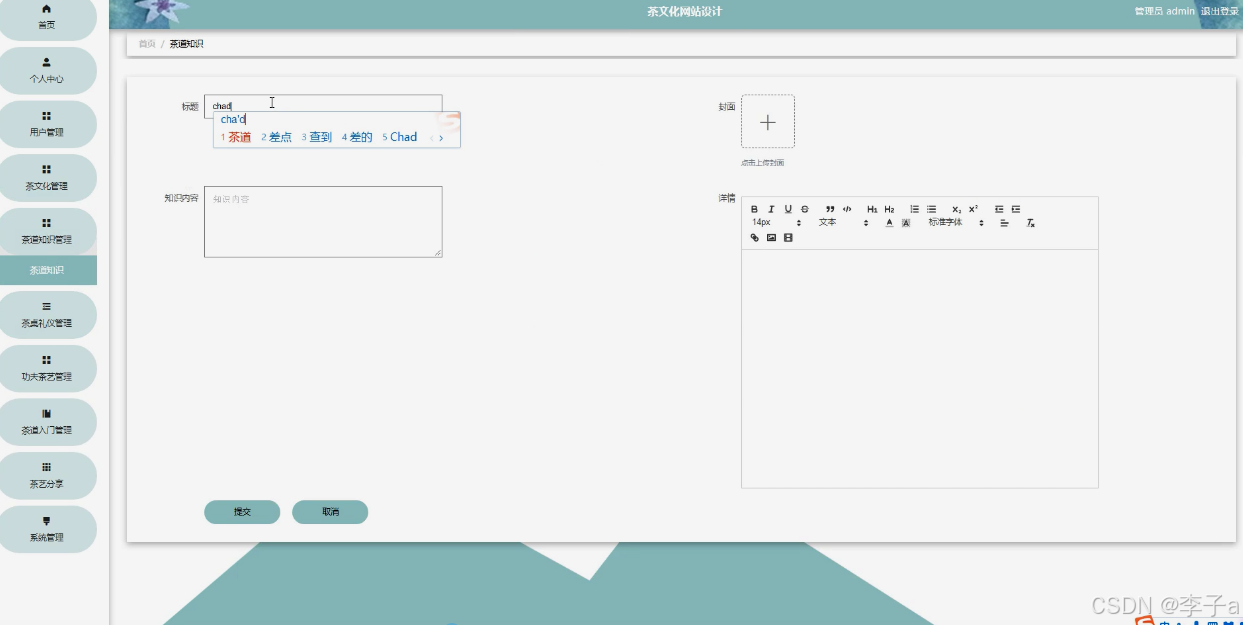 另一方面,网站集成的丰富茶文化内容,如茶道知识、茶桌礼仪、功夫茶艺等,不仅能够提升公众对茶文化的认知与兴趣,还能促进茶产业的多元化发展,带动相关产业链的经济增长。[9] 陆建平, 张小龙, 翁凯迪, 丁志千, 傅书畅, 赵大禹. 基于Java的储罐安全管理平台设计与实现[J]. 化工装备技术, 2021, 42 (04): 34-38。[3] 郭晶晶, 刘学博. 基于Java的参数设置管理系统的设