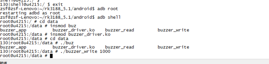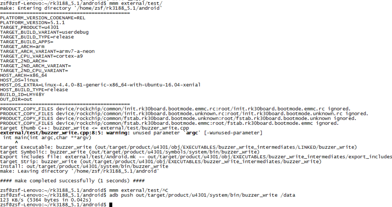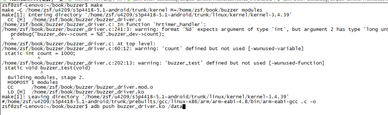 编译驱动:错误和警告可以忽略,之后使用adb工具将buzzer_driver.ko推送进板子。