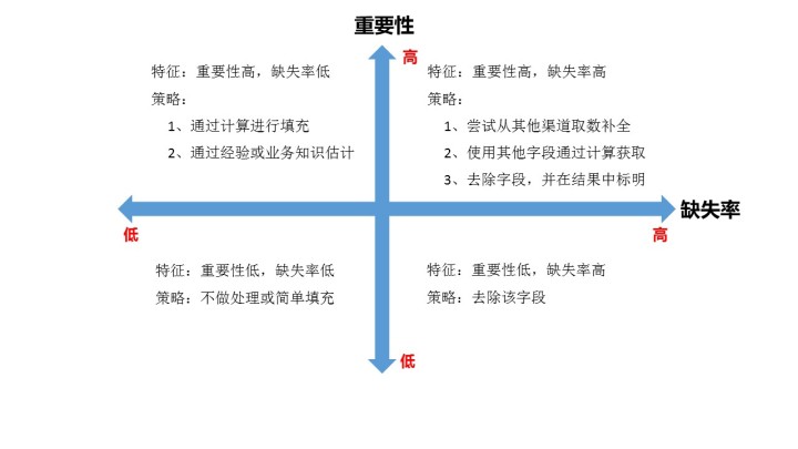 1、确定缺失值范围:对每个字段都计算其缺失值比例,然后按照缺失比例和字段重要性,分别制定策略,可用下图表示:
