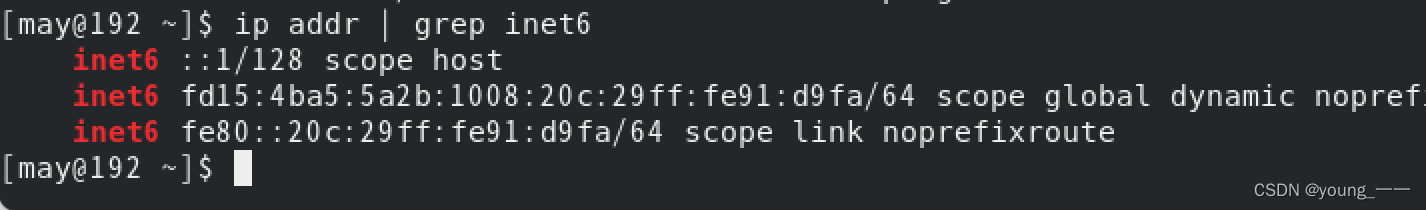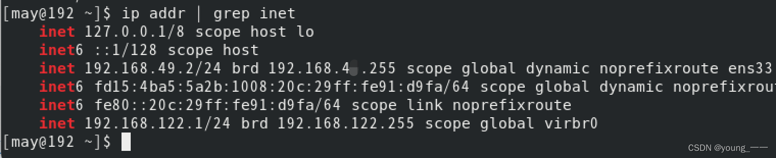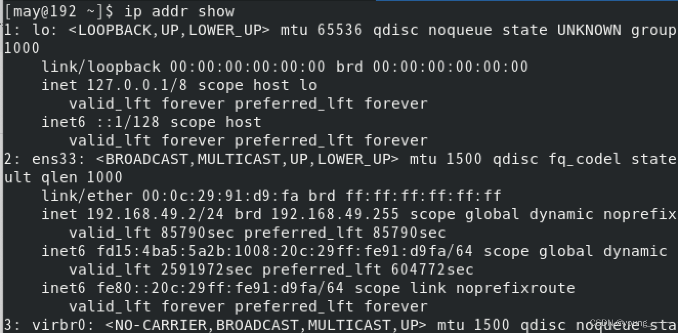 ip addr 或者 ip addr show输出包含了网络接口的名称、状态、MTU(Maximum Transmission Unit)、链路层地址(如MAC地址)、IPv4和IPv6地址等信息。