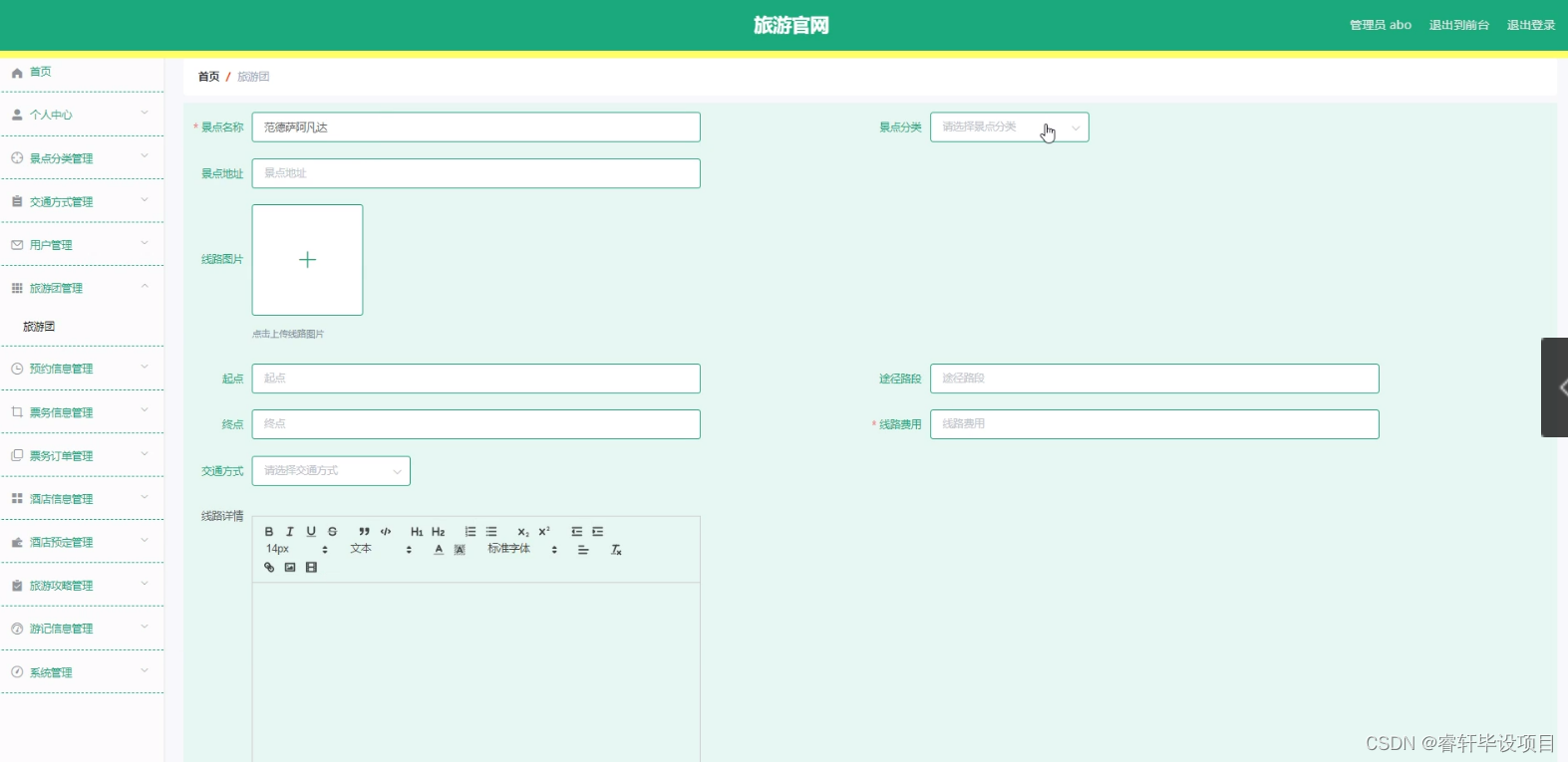 后端服务接收到请求后,执行相应的业务逻辑处理,这通常包括与MySQL数据库的交互,如查询数据、插入记录、更新或删除数据等操作。这样,前端Vue.js和后端Spring Boot框架的接口紧密协作,而MySQL数据库则作为数据存储和管理的核心,确保了整个系统的数据一致性和高效处理。本选题旨在设计并实现一个内容丰富、界面友好、操作便捷的旅游官网,集成景点介绍、旅游攻略、在线预订、用户评价和互动交流等功