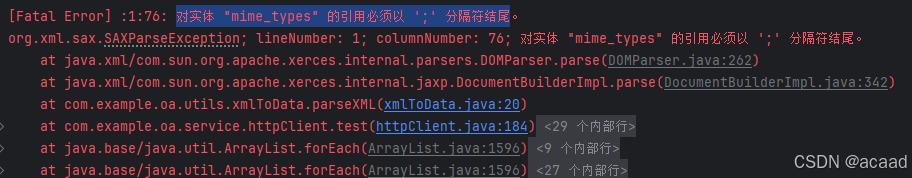 1、返回数据中的字段可能包含“&”,解析中会报错“对实体 "mime_types" 的引用必须以 ';' 分隔符结尾”,如下图