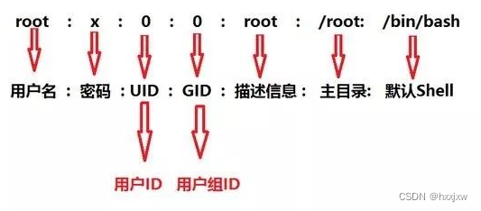 用户名:口令(密码位):用户标识号(用户ID):组标识号(主用户组ID):注释性描述(备注):主目录:Shell