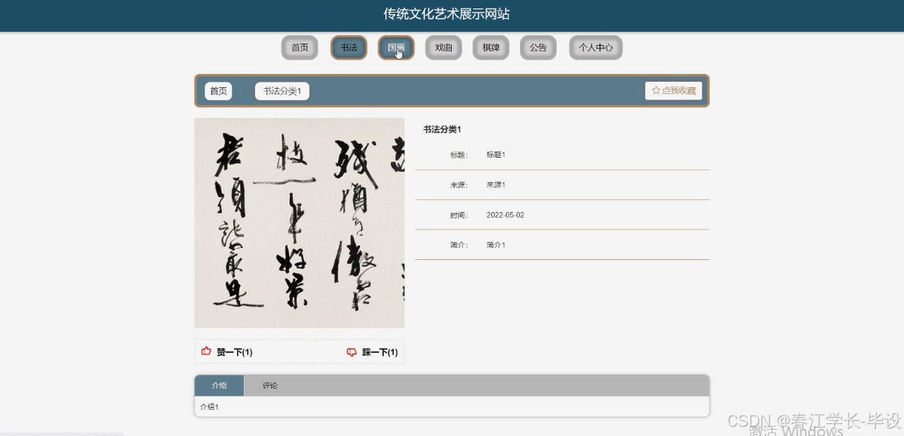 本研究的主要目的是设计并实现一个功能完善、用户友好的传统文化艺术展示网站。该网站将涵盖书法、国画、戏曲、棋牌等多种传统文化艺术形式,通过分类展示、作品搜索、用户互动等功能,为公众提供一个便捷、生动的传统文化艺术学习平台。同时,通过该网站的建设与运营,探索数字化技术在传统文化艺术传播中的实际应用效果,为传统文化艺术的保护与传承提供新的思路和方法。