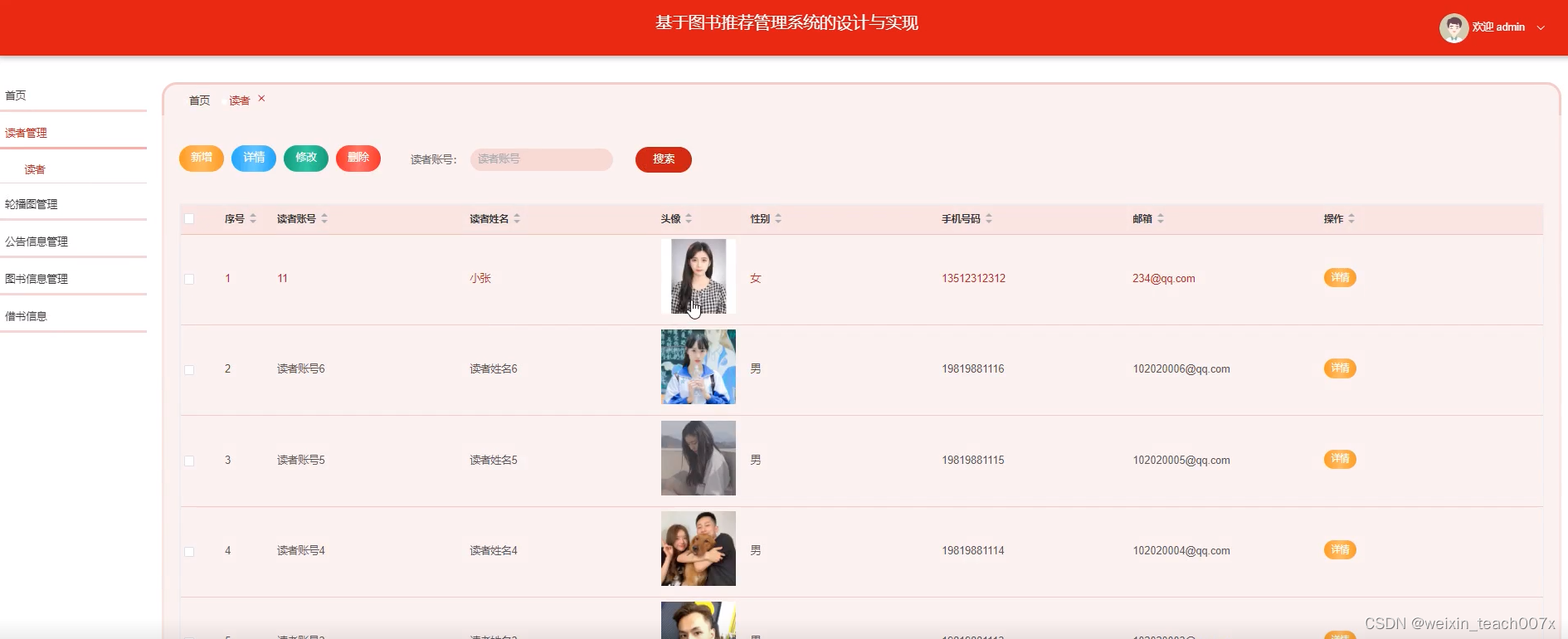 管理员点击读者管理。在读者页面输入账号和姓名进行查询、新增或删除读者列表,并根据需要对读者详情信息进行详情、修改或删除操作;如图5-8所示: