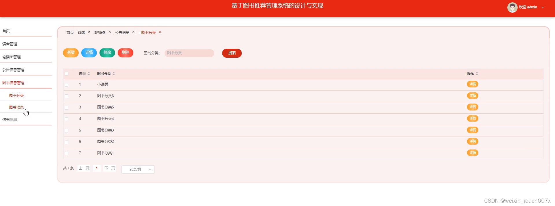 管理员点击图书分类管理。进入图书分类页面输入图书分类进行查询、新增或删除图书分类列表,并根据需要对图书分类详细信息进行详情、修改或删除操作。如图5-9所示: