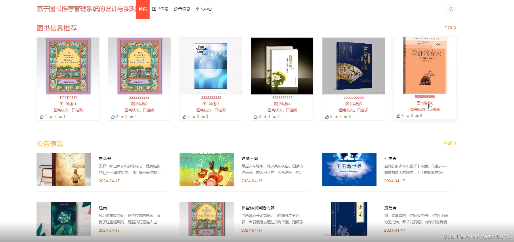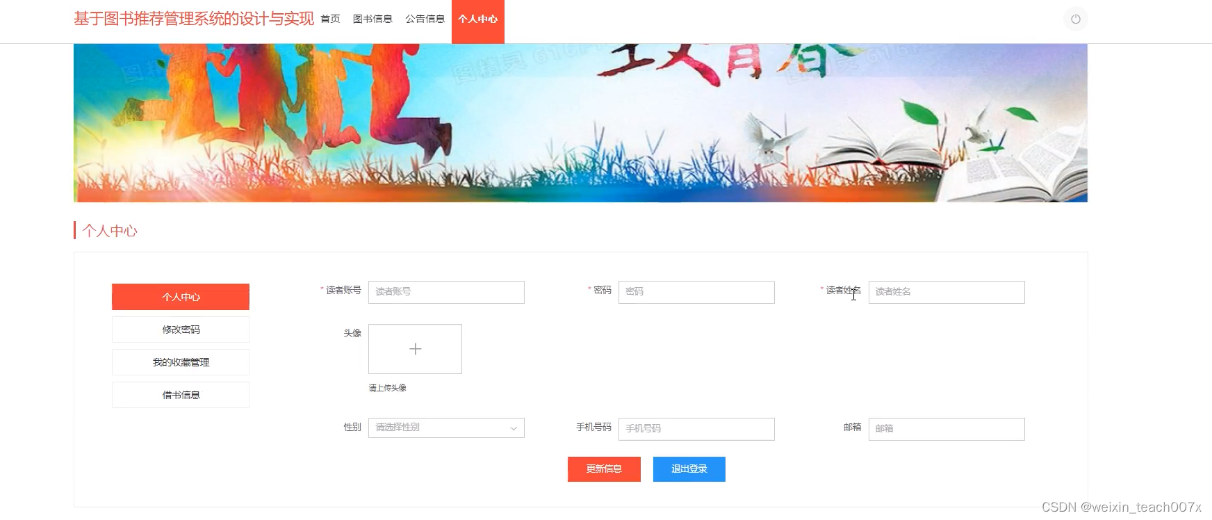 读者的功能主要是对首页、图书信息、公告信息、在线咨询、个人中心等进行操作。