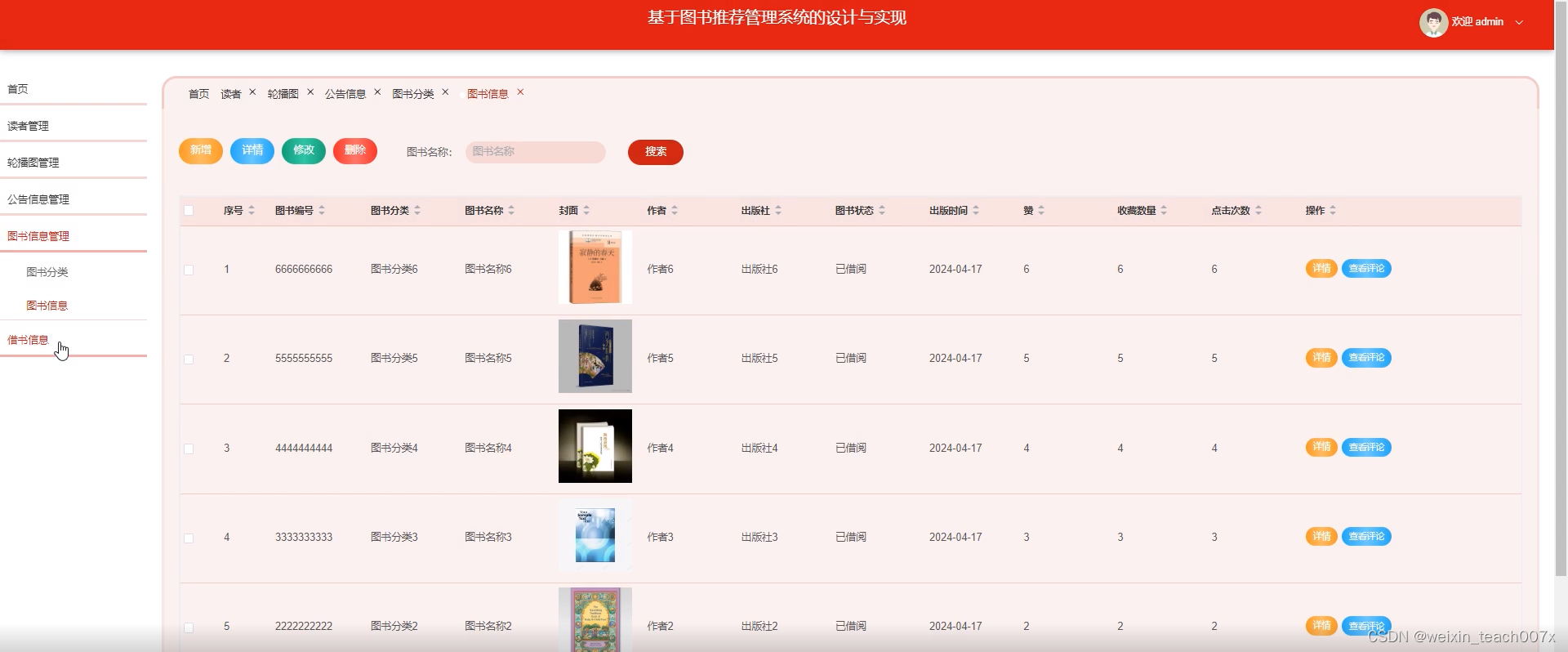管理员点击图书信息管理。在图书信息页面输入图书名称、图文位置、作者和出版社进行查询、新增、删除,并根据需要对图书详细信息进行详情、修改、查看评论或删除操作。如图5-10所示: