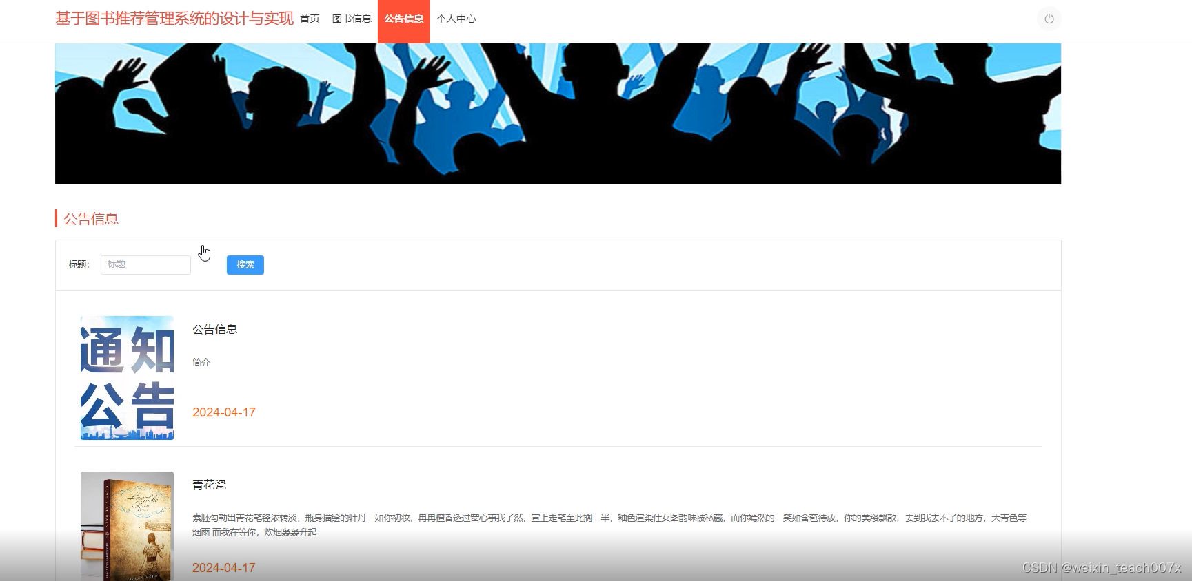 公告信息:在公告信息页面的输入栏中输入标题进行查询,可以查看公告详细信息;如图5-4所示:
