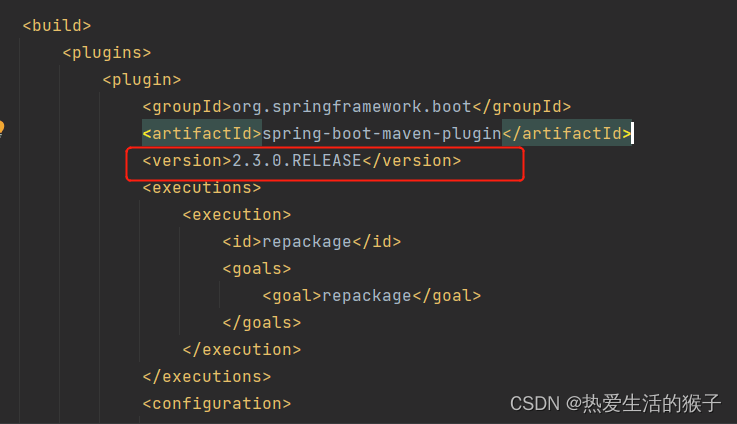 还有一种爆红,就是<plugin></plugin>爆红,这种情况是缺少版本号,或者是父类的版本号没读到,可以直接加上去,比如spring-boot-maven-plugin红色,加上spring-boot的版本号。