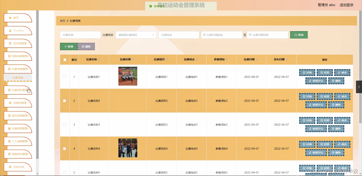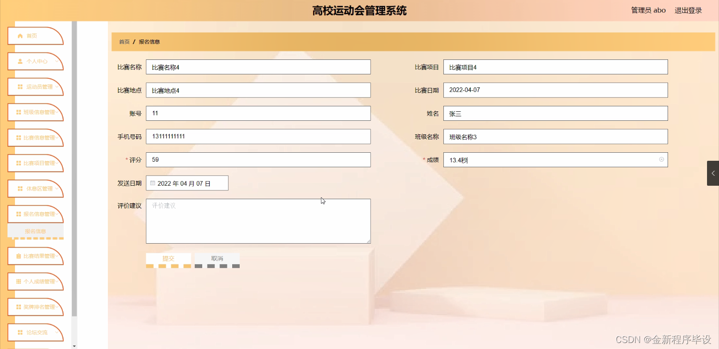 通过这些功能的实现,高校运动会管理系统将能够实现对运动会全过程的精细化管理,提升管理效率,减少人为错误,为运动会的顺利进行提供有力保障。