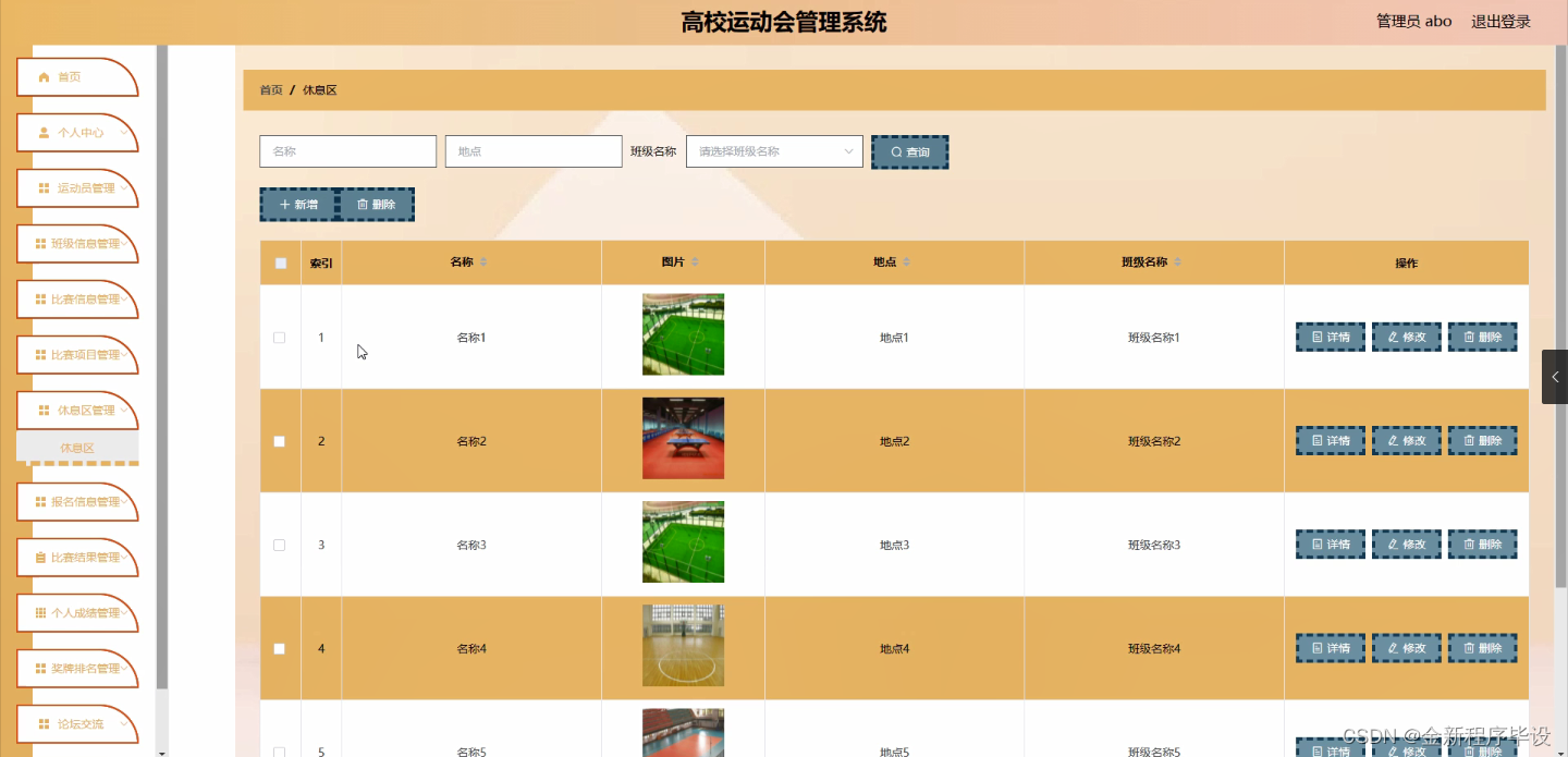 具体而言,运动员信息管理模块将实现运动员基本信息的录入、查询和修改功能,确保运动员信息的准确性和完整性;班级信息管理模块则负责记录各班级的基本信息,为比赛分组和成绩统计提供依据;比赛信息管理和比赛项目管理模块将实现比赛日程的发布、比赛项目的设置以及比赛规则的制定等功能;休息区管理模块则能够实时更新休息区的使用情况,确保比赛期间运动员能够得到充分休息;报名信息管理模块负责收集和处理运动员的报名信息,实现报名流程的自动化;比赛结果和个人成绩管理模块则能够实时记录并展示比赛结果和个人成绩,为成绩统计和排名提供依据;最后,奖牌排名模块将根据比赛成绩自动生成奖牌榜,直观展示各班级和运动员的竞赛成绩。