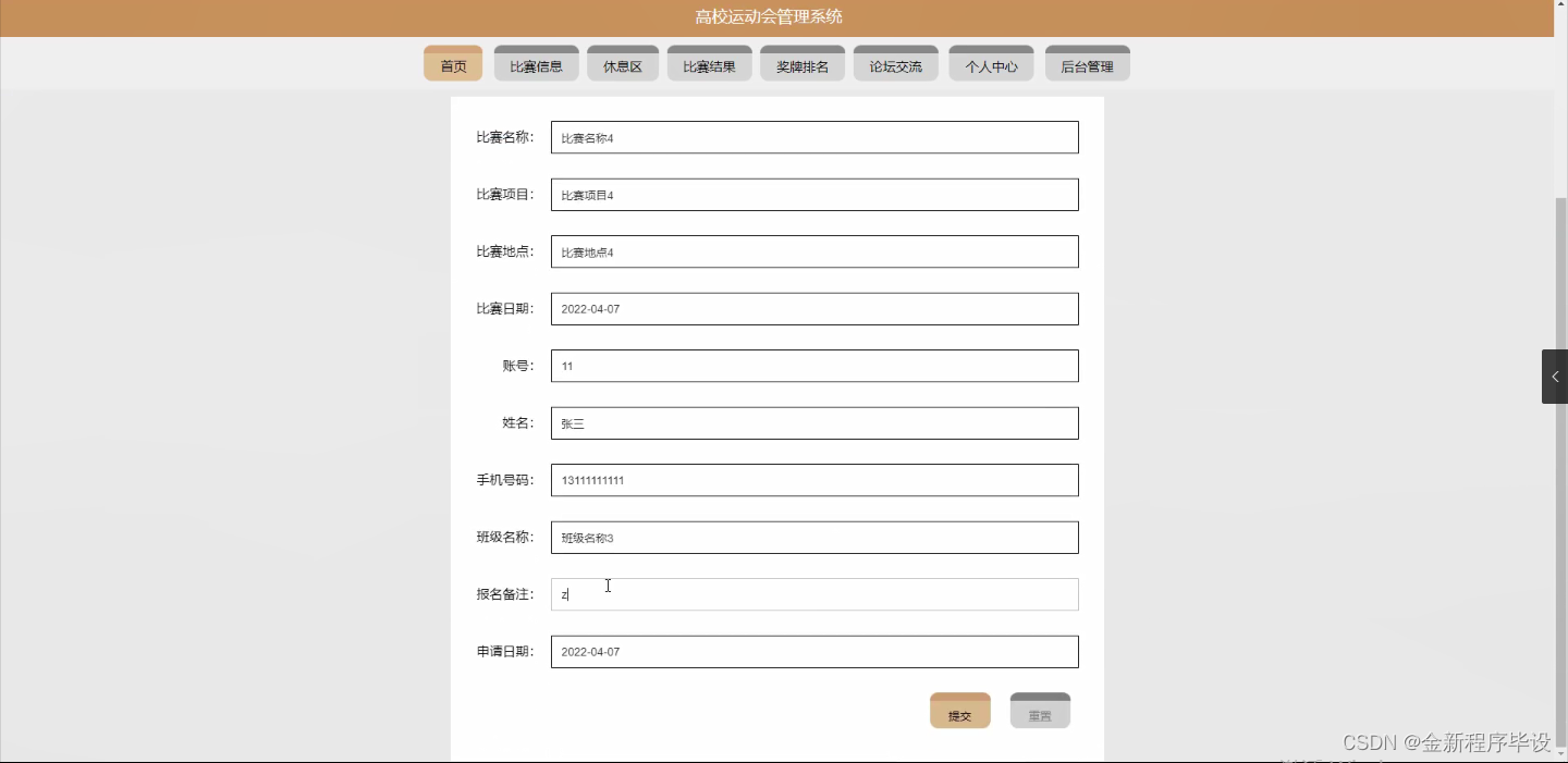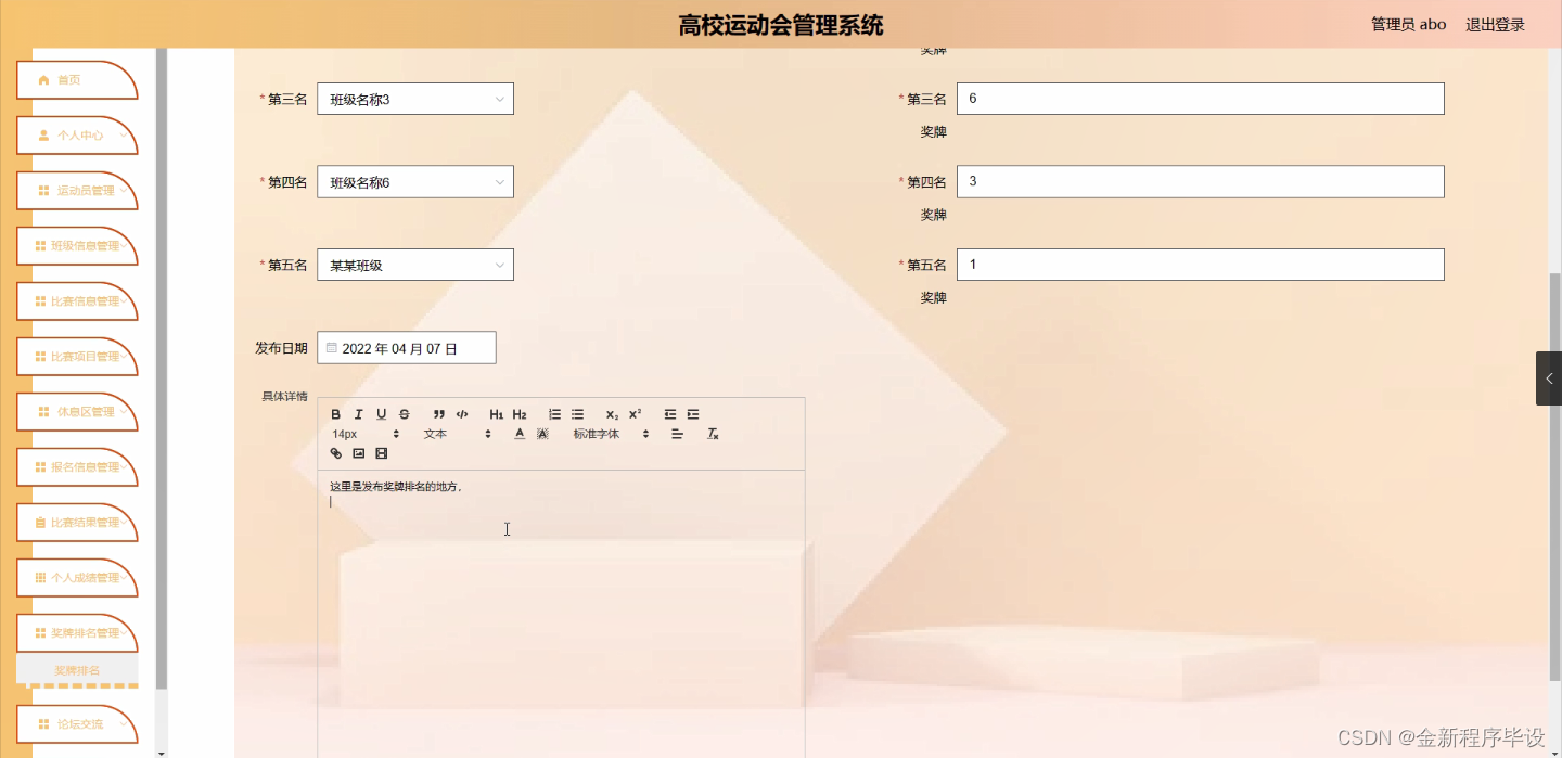 本研究内容主要聚焦于高校运动会管理系统的设计与实现,该系统旨在通过计算机技术对运动会相关数据进行高效管理,提升运动会的组织效率和水平。系统功能涵盖了运动员信息管理、班级信息管理、比赛信息管理、比赛项目管理、休息区管理、报名信息管理、比赛结果管理、个人成绩管理以及奖牌排名等多个方面。