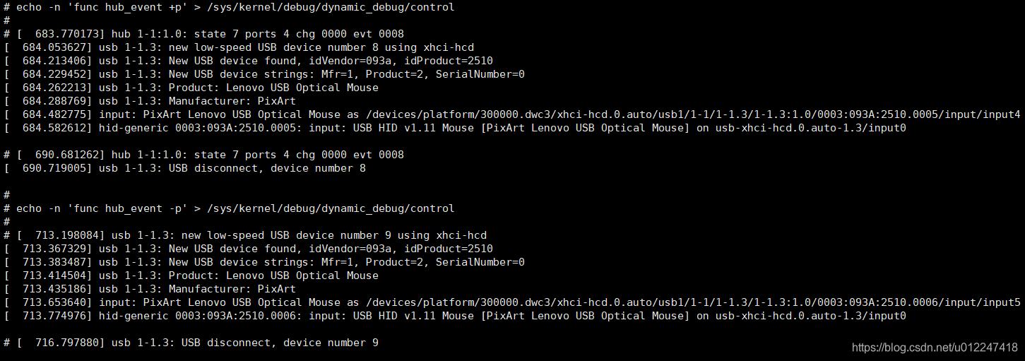 enable: echo -n 'func hub_event +p' > /sys/kernel/debug/dynamic_debug/control