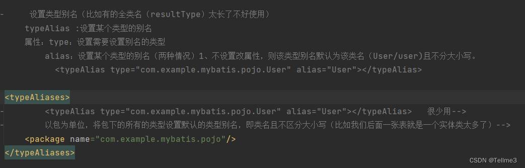 设置类型别名(比如有的全类名(resultType)太长了不好使用)typeAlias :设置某个类型的别名属性:type:设置需要设置别名的类型alias:设置某个类型的别名(两种情况)1、不设置改属性,则该类型别名默认为该类名(User/user)且不分大小写。使用:以包为单位,将包下的所有