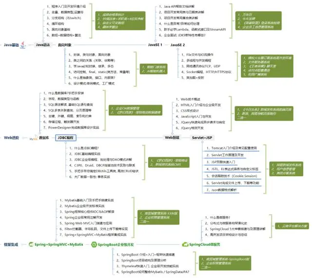 你在大学时期应该明确自己的发展方向,如果你在大一就确定你以后想成为Java工程师,那就不要花太多的时间去学习其他的技术语言,高数之类的,不如好好想着如何夯实Java基础。下图涵盖了应届生乃至转行过来的小白要学习的Java内容: