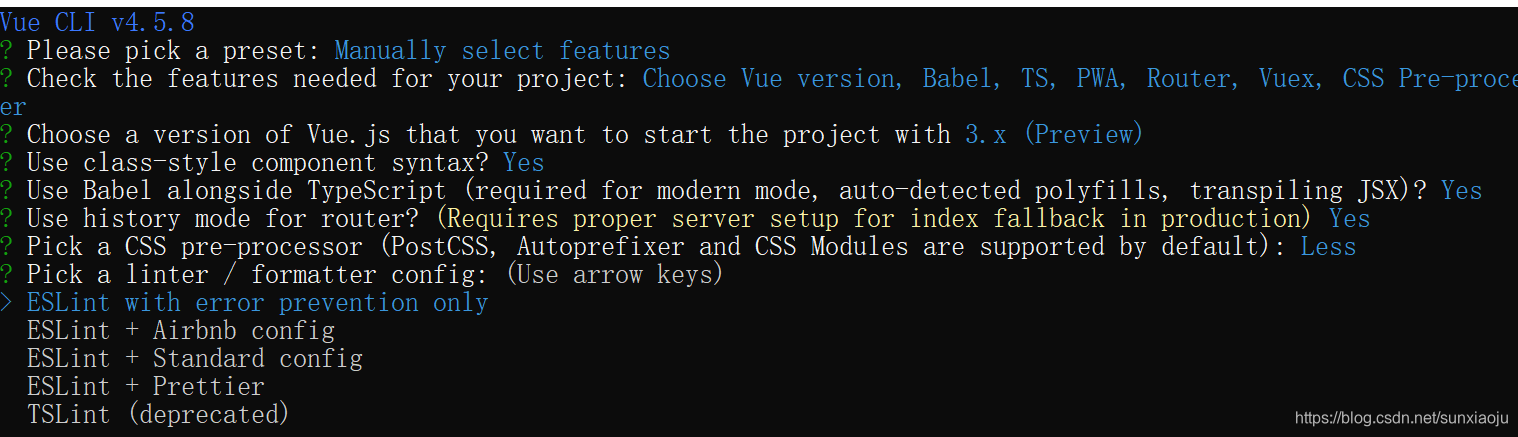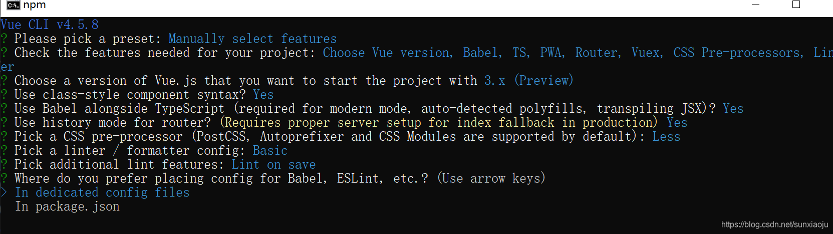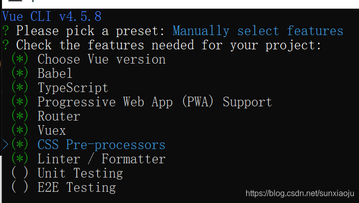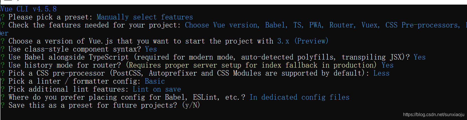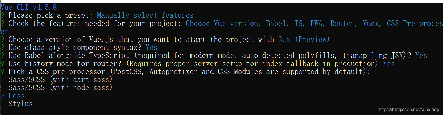8、回车后凡是出现让输入y/n时都一律输入y,此时选择Less回车表示CSS预处理器选择,如下图所示: