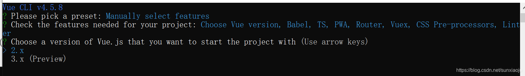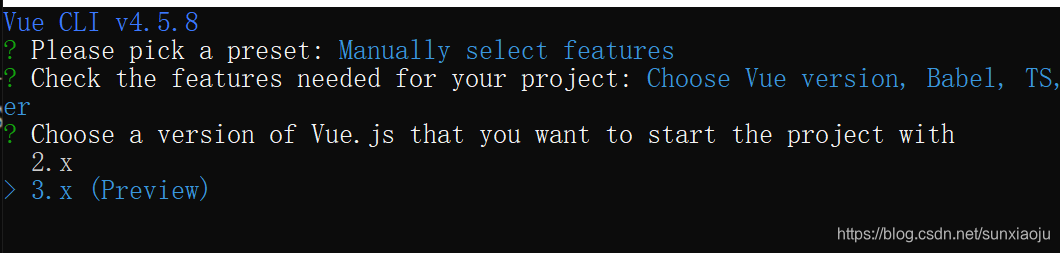 7、这里是选择使用2.x还是3.x版本的vue,这里选择3.x的,如下图所示: