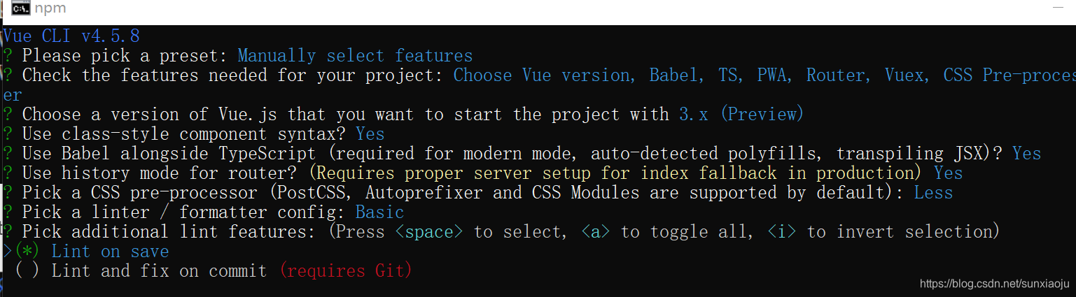 10、选择语法检查的时期,Lint on save表示保存时检查,Lint and fix on commit表示提交时检查,这里选择保存时检查,如下图所示: