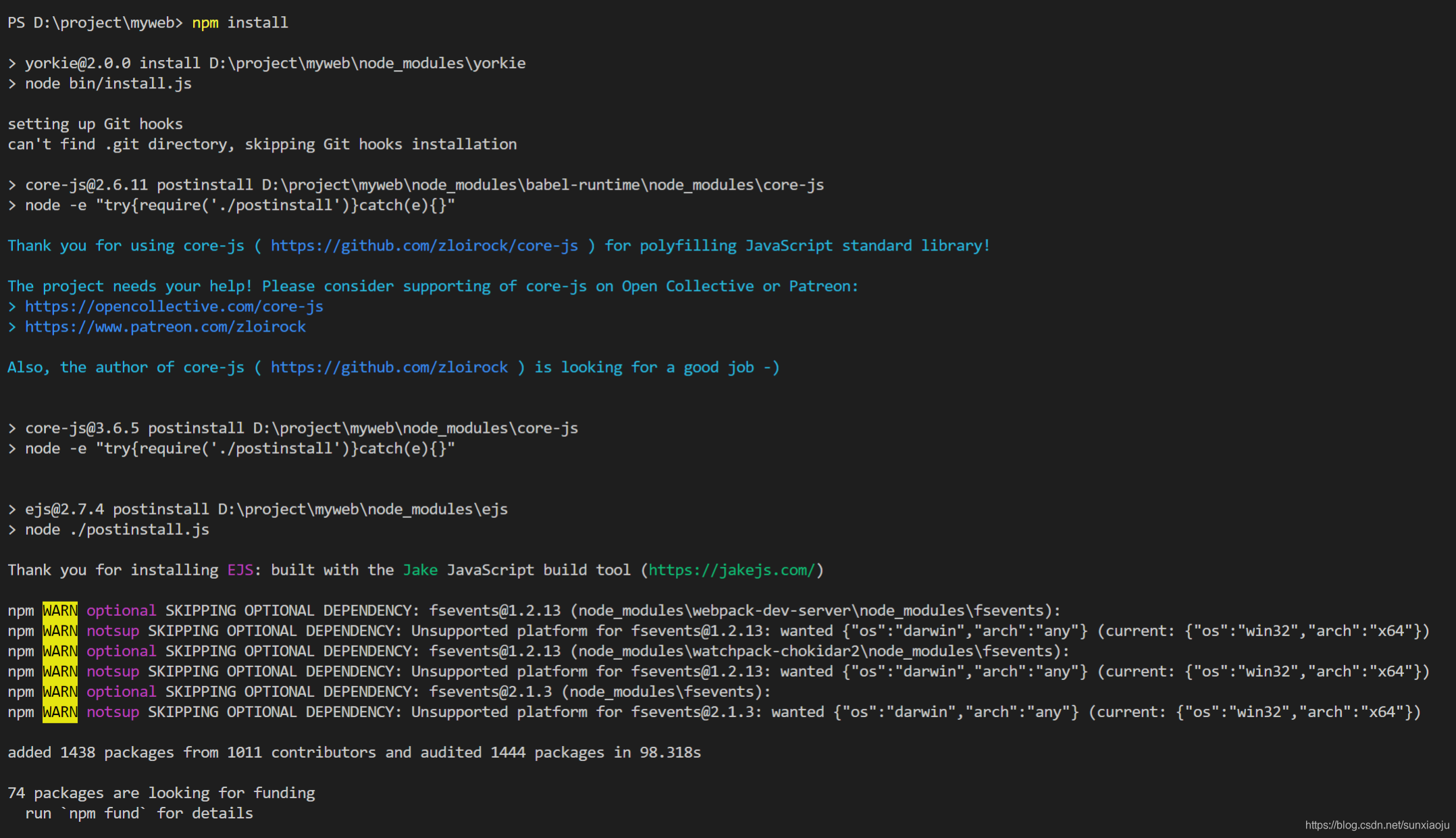 13、输入y后直接回车,一直回车即可,此时就会下载对应的npm包,如下图所示: