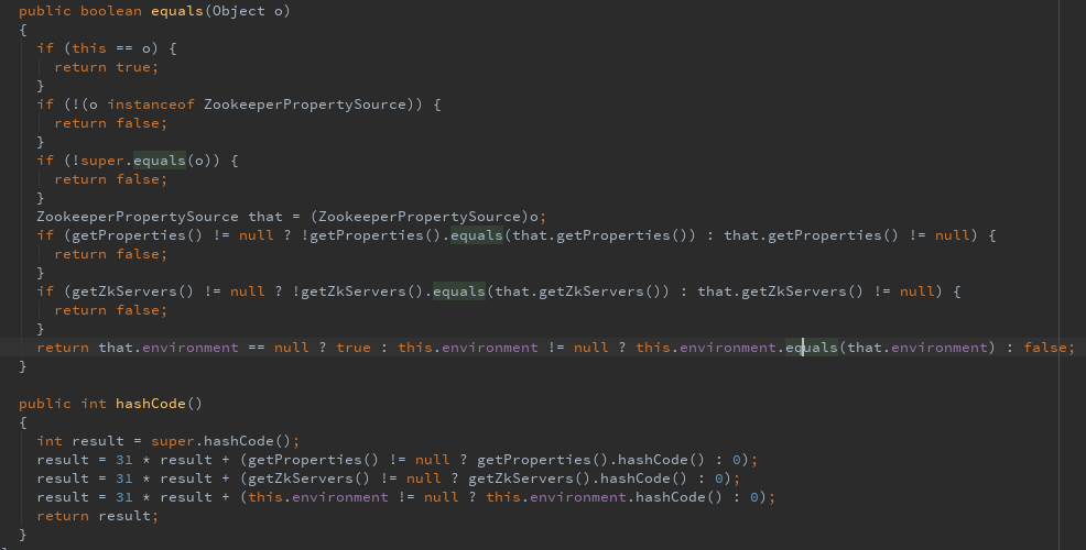 ZookeeperPropertySource重写了equals和hahscode方法,根据这两个方法可以判定配置中心是否修改了属性。