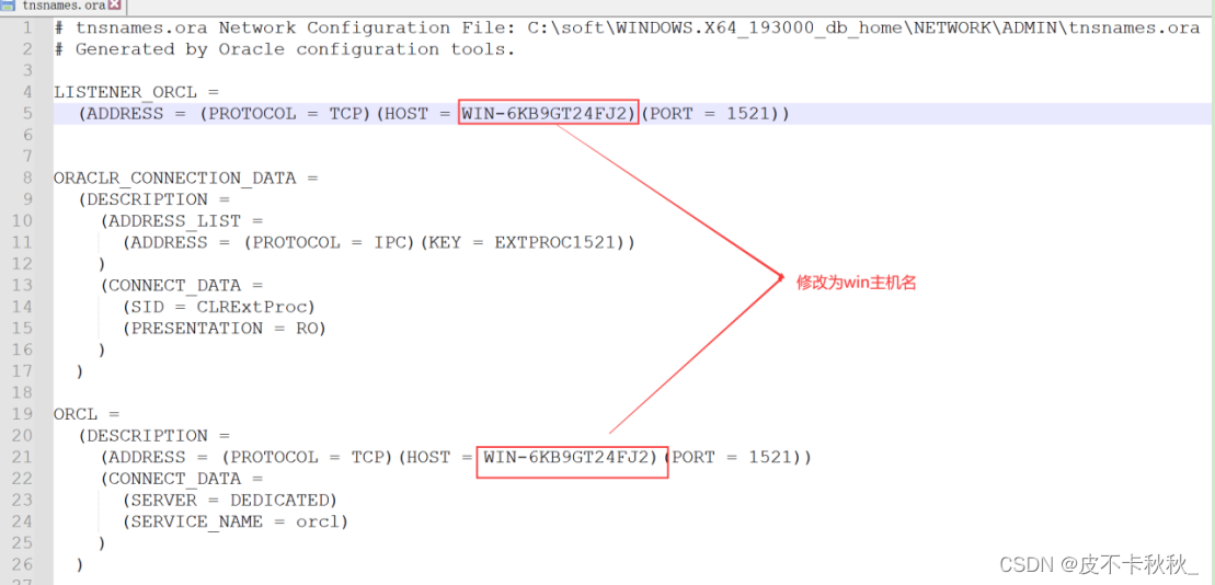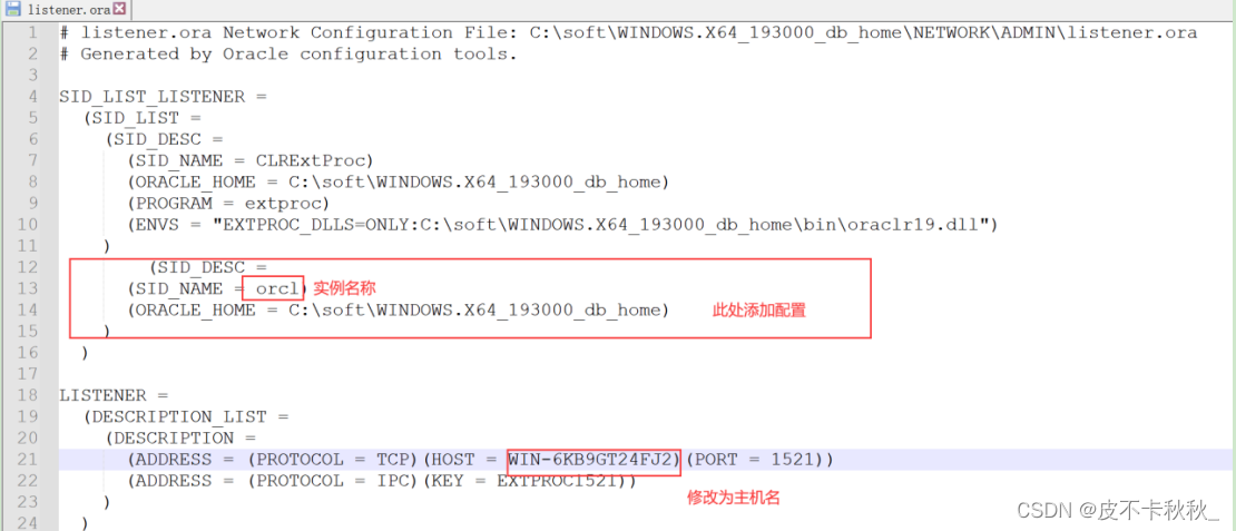 进入监听配置文件路径C:\soft\WINDOWS.X64_193000_db_home\network\admin\,备份原文件并修改listener.ora和tnsnames.ora文件