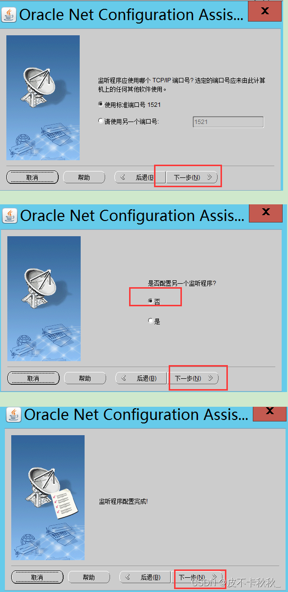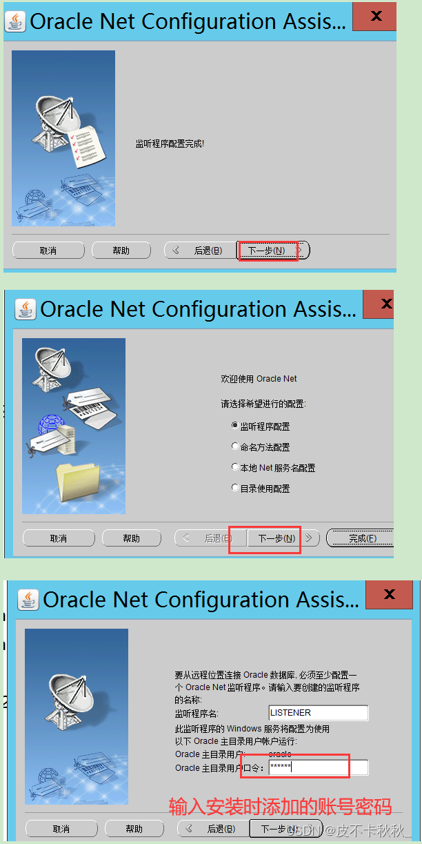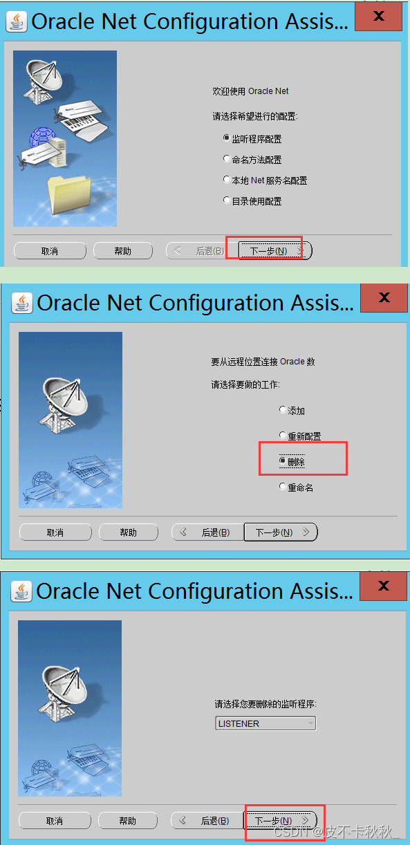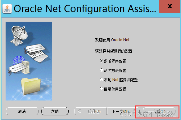 进入监听配置文件路径C:\soft\WINDOWS.X64_193000_db_home\network\admin\,备份原文件并修改listener.ora和tnsnames.ora文件。Oracle搭建好了之后,发现只能在服务器本机链接oracle,其他客户端无法链接,这是因为监听地址是本地localhost,重建监听即可。从开始下找到配置监听的程序,将原先的监听先删除,然后进行新的监听添加