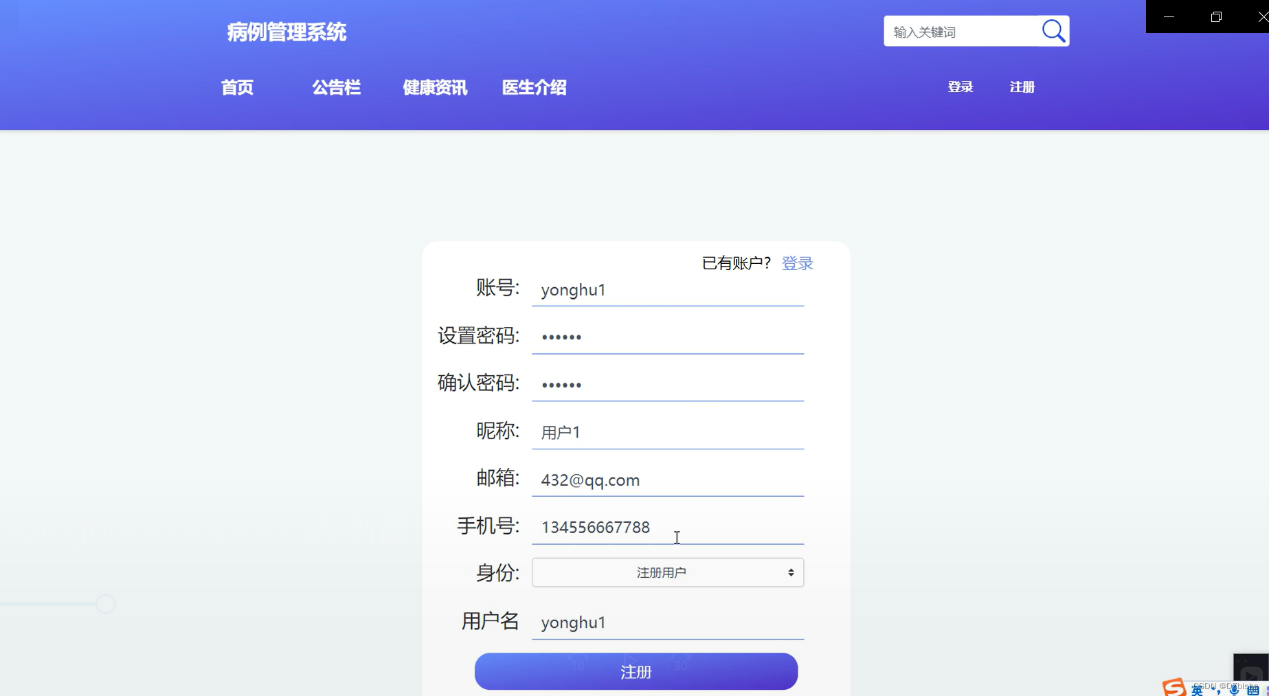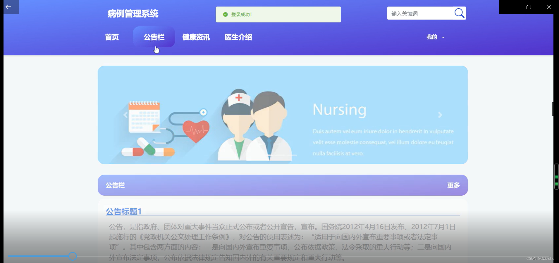 本设计主要实现集人性化、高效率、便捷等优点于一身的病例管理系统,完成后台首页、公告内容(轮播图、公告栏)系统用户(管理员、注册用户、医生)内容模块(健康资讯、资讯分类)模块管理(医生介绍、科室管理、就诊预约、就诊病历、病例管理)等功能模块。系统通过浏览器与服务器进行通信,实现数据的交互与变更。只需通过一台电脑,动动手指就可以操作系统,实现数据通信管理。整个系统的设计过程都充分考虑了数据的安全、稳定及可靠等问题,而且操作过程简单。本系统通过科学的管理方式、便捷的服务提高了工作效率,减少了数据存储上的错误和遗漏。