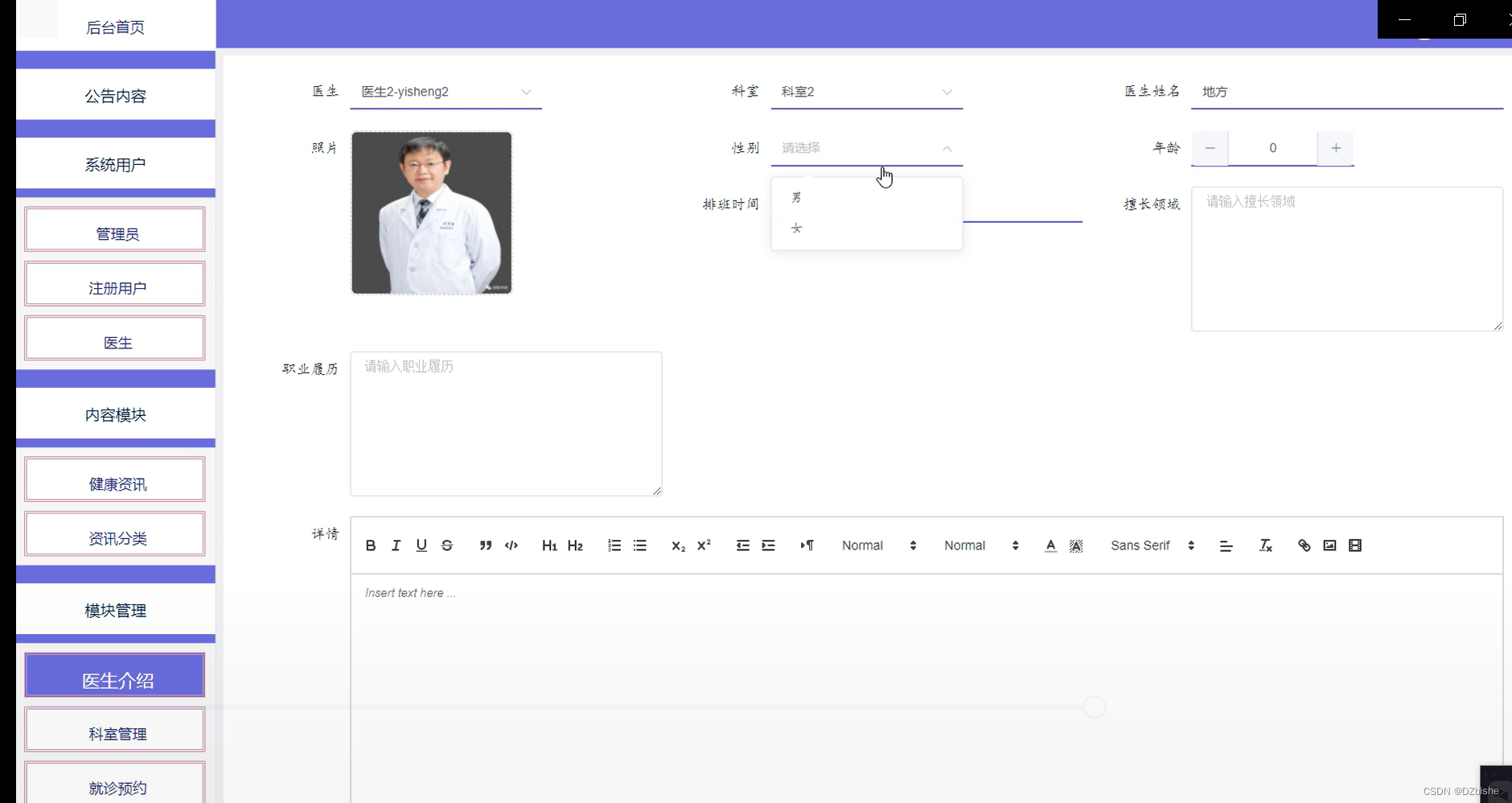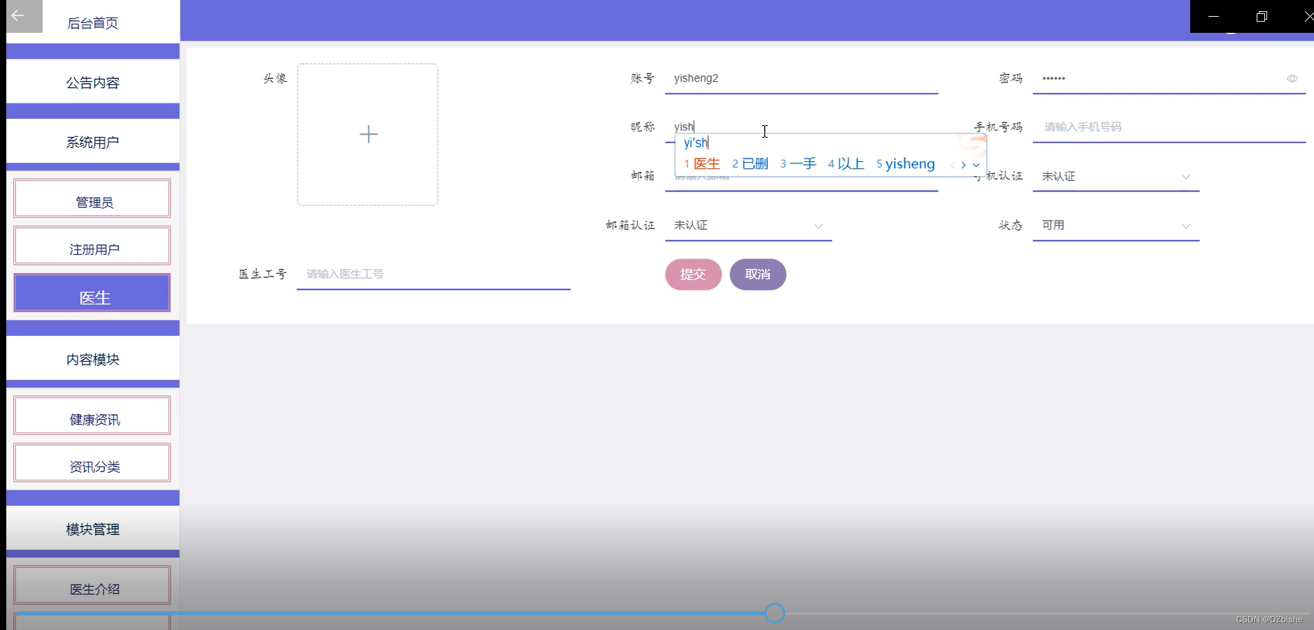 添加医生介绍信息时,输入必填字段后,完成对整个添加医生介绍信息的操作。