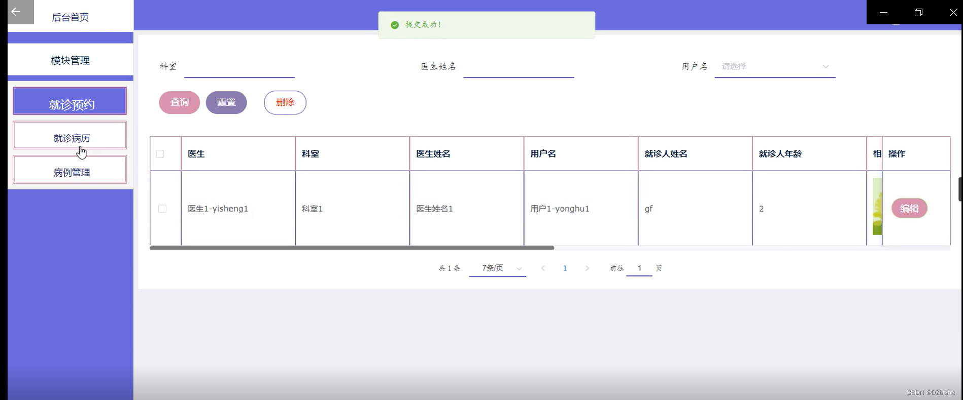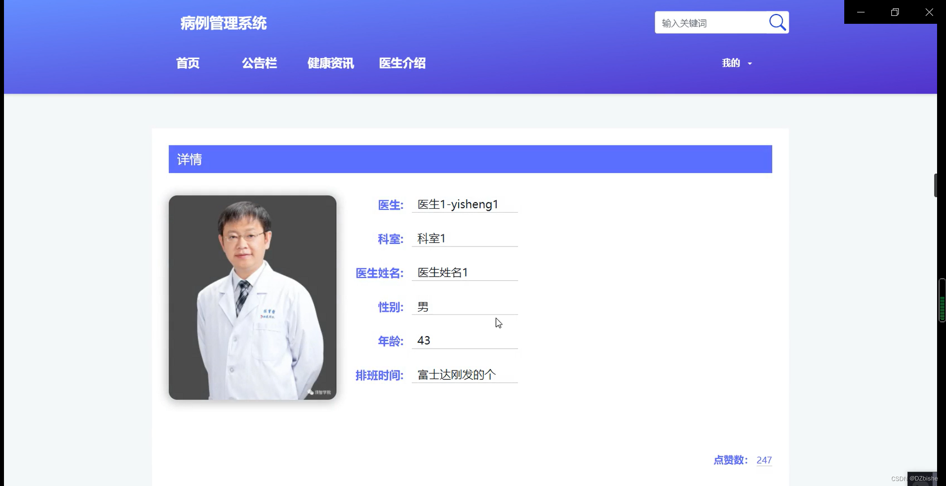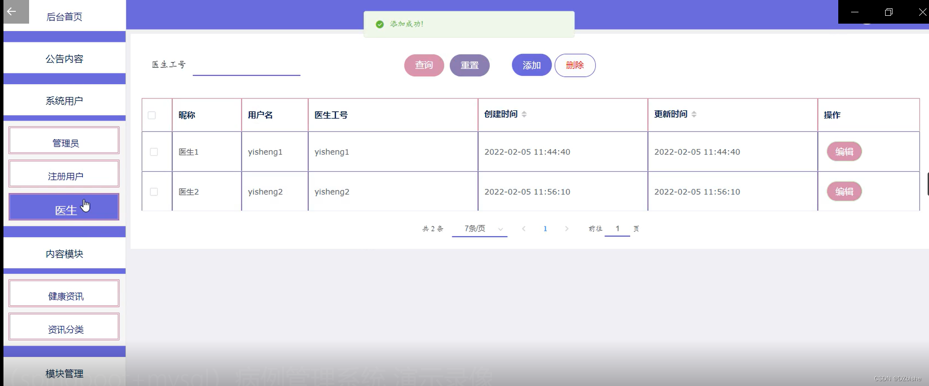 发布医生、病人,并可以销毁某个医生、病人,更新医生、病人数据,模糊搜索医生、病人数据等。