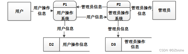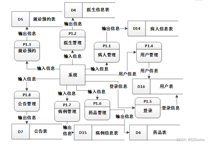 二层数据流程是对一层数据流层图中填写登录注册信息、用户功能的细化。即:填写登录注册信息细化为填制信息、后台审核,用户功能细化为就诊预约、工资查看、通知查看等操作。