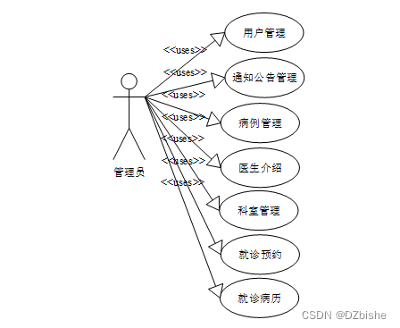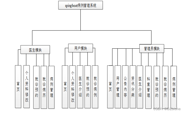 病例管理系统在对需求做解析后,整个系统主要分为三个部分:管理员、医生和用户,每个模块下的分支功能不一样。对功能做出如下说明:
