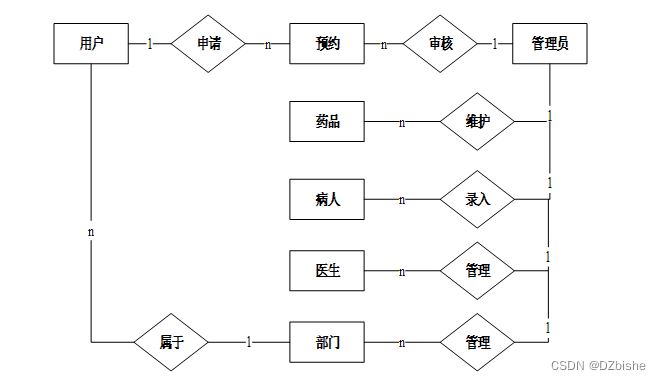 对于一个要开发的系统来说,E-R图可以让别人能更快更轻松的了解此系统的事务及它们之间的关系。根据系统分析阶段所得出的结论确定了在病例管理系统中存在着多个实体分别是用用户、管理员、药品、医生、病人、就诊预约。
