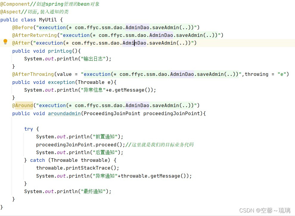 启动 AspectJ 支持:<aop:aspectj-autoproxy /><!--自动代理-->