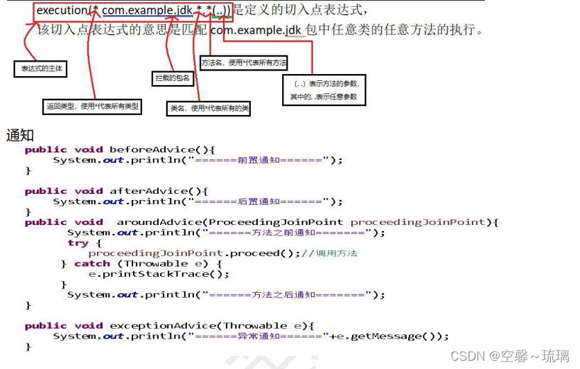 通知(Advice): 通知是指一个切面在特定的连接点要做的事情(增强的功能)。通知分为方法执行前通知,方法执行后通知,环绕通知等.