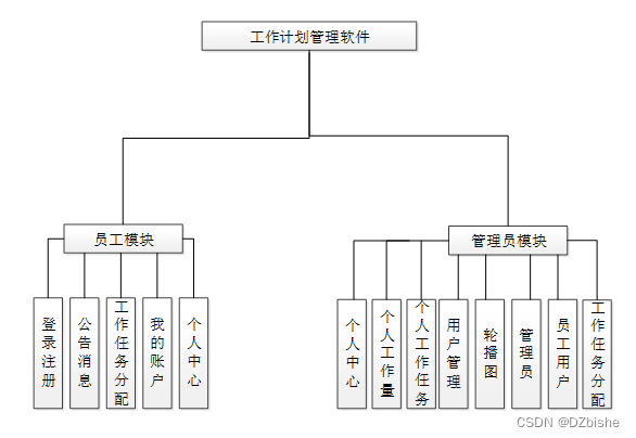 工作计划管理软件在对需求做解析后,整个系统主要分为两个部分:管理员和普通用户,每个模块下的分支功能不一样。对功能做出如下说明: