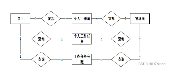对于一个要开发的系统来说,E-R图可以让别人能更快更轻松的了解此系统的事务及它们之间的关系。根据系统分析阶段所得出的结论确定了在工作计划管理软件中存在着多个实体分别是用员工、管理员、个人工作量、评论、个人工作任务、工作任务分配。