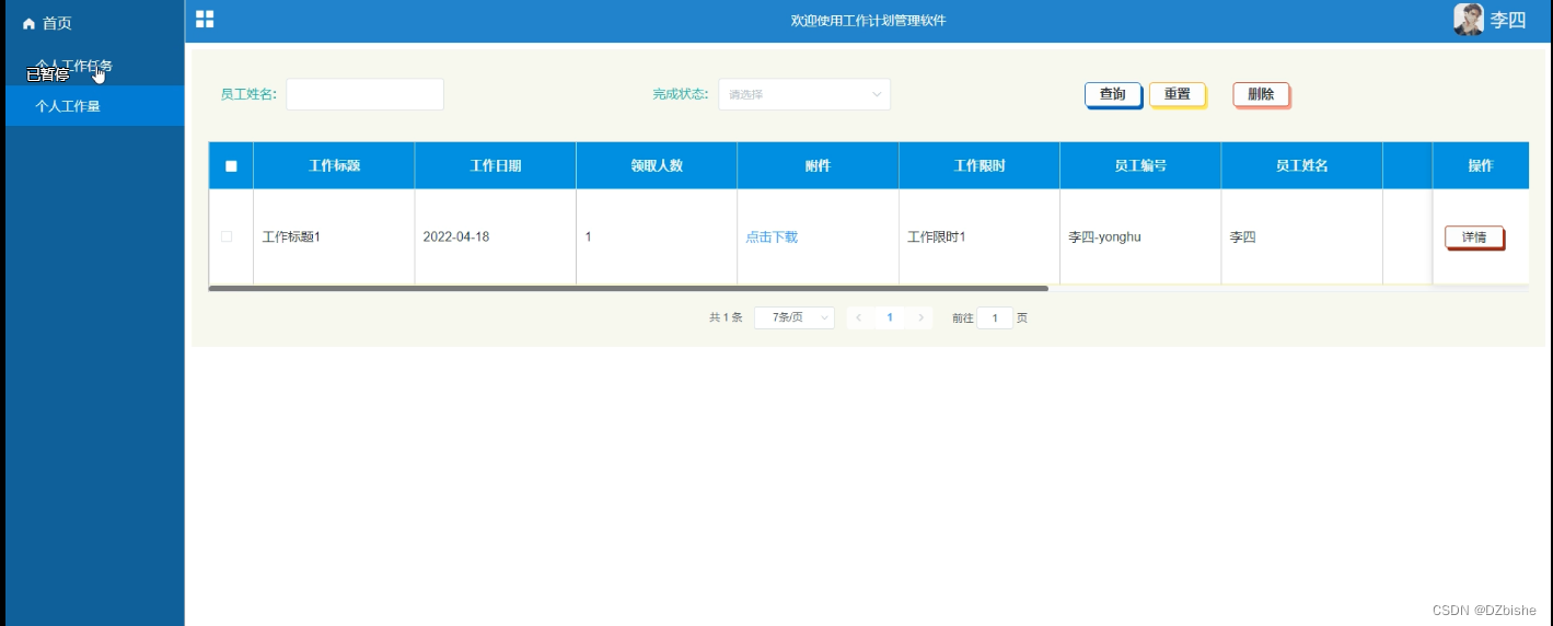 个人工作任务(个人工作任务id、工作标题、工作日期、领取人数、附件、工作限时、员工编号、员工姓名、完成状态、工作内容、备注)