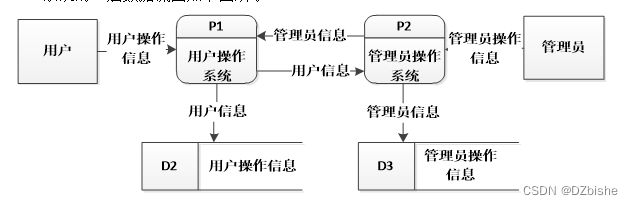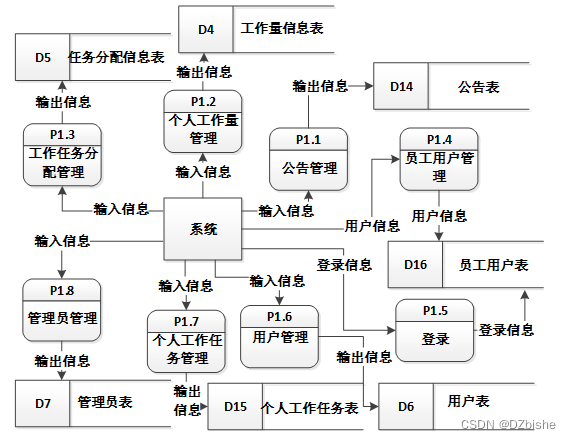 二层数据流程是对一层数据流层图中填写登录信息、用户功能的细化。即:填写登录信息细化为填制信息、后台审核,用户功能细化为员工资料修改、工作任务分配、个人工作任务、个人工作量等操作。