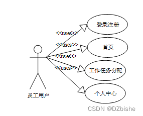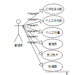 系统设计的目的是分析系统包括的所有功能结构,为开发人员设计开发和实现系统做好准备工作。经过前期的需求调查、分析和整理之后,确定的总体需求主要包括多个模块,分别是:员工用户、公告栏、轮播图、管理员、工作任务分配、个人工作任务、个人工作量。系统整体角色分为死个部分,一是员工、最后是管理员。权限分布也是很明显,员工用户是在除去浏览信息之外还具有查询和管理自己账户信息、工作任务分配等权限;管理员是最高权限拥有者。