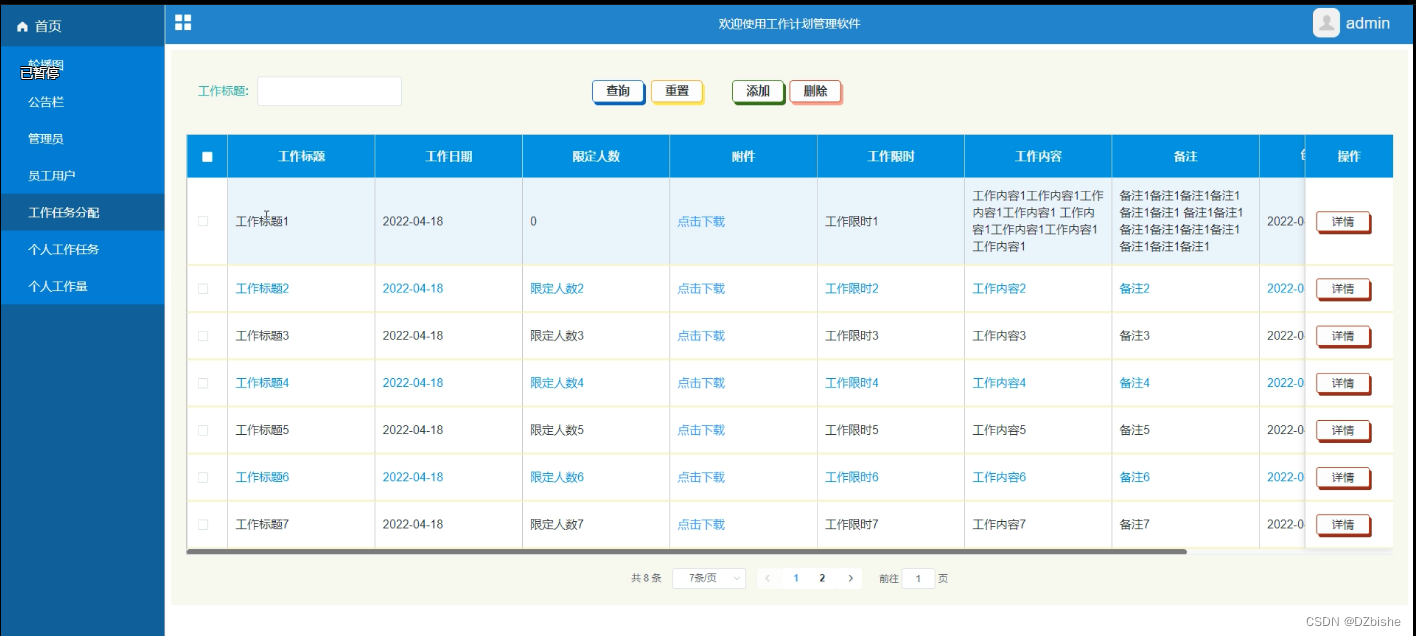 工作任务分配(工作任务分配id、工作标题、工作日期、限定人数、附件、工作限时、工作内容、备注、点击数)