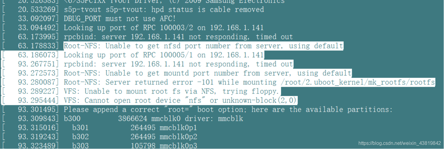 解决uboot使用nfs启动失败的问题1.1 当前情况说明:(1) kernel相应的网络和文件系统的配置设置都是正确的、ubuntu中的nfs搭建也没有问题。(2) uboot与ubuntu能够互相ping通。(3) boot_args设置为: set bootargs ...