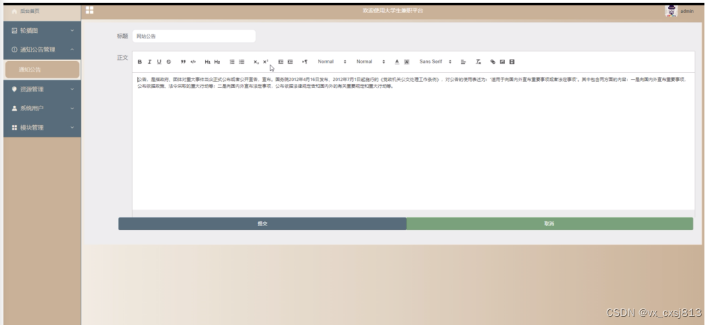 通知公告管理:管理员在这一栏可以编辑标题+内容进行发布、查询、重置、删除、添加等操作,如图5-7,5-8所示。