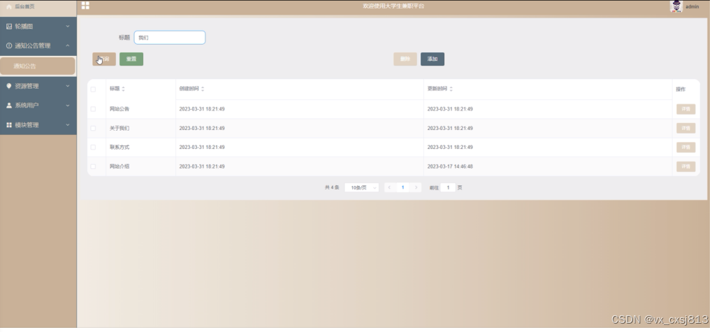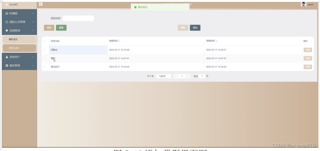 资源管理:管理员在这一栏可以看到兼职资讯+资讯分类这两个子菜单,管理员可对兼职进行分类、查询、重置、删除、添加等操作,如图5-9,5-10所示。