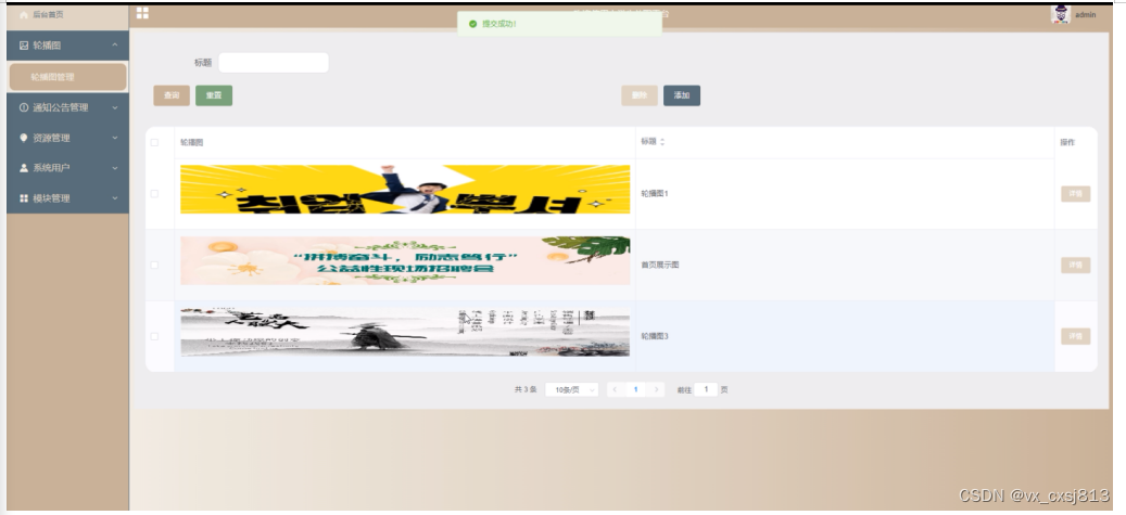 轮播图管理:管理员在这一栏可以编辑标题+图片等详细描述信息进行发布、删除、添加等操作,如图5-5 5-6所示。